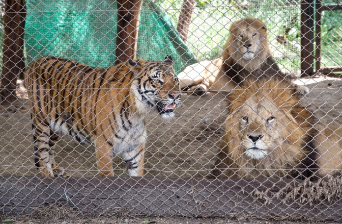 León y tigre del ex Zoológico de Luján, confinados en sus jaulas tras la clausura.